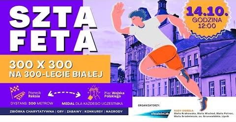Z tej okazji Stowarzyszenie Niezależni.BB razem z radami osiedli Biała Krakowska, Biała Północ, Biała Wschód, Biała Śródmieście, Grunwaldzkim i Lipnikiem organizują „Sztafetę 300 x 300 na 300-lecie Białej”. Trasa o długości 300 metrów zaczynać się będzie przy pomniku Reksia, poprowadzi w kierunku Placu Wojska Polskiego i z powrotem do pomnika Reksia. Idea sztafety polega na przebięgnięciu przez 300 uczestników dystansu 300 metrów. Uczestnicy mogą biec indywidualnie lub w małych, kilkuosobowych grupkach. Dystans jest tak dobrany, by każdy mógł się z nim zmierzyć, nawet jeśli zrobi to truchtem lub np. na wózku inwalidzkim, hulajnodze lub dziecięcym rowerku. Czas nie będzie mierzony, istotne jest samo uczestnictwo oraz cel charytatywny. Całość dochodu z imprezy, w tym wpisowe uczestników, będzie przeznaczone na leczenie i rehabilitację małego Fabianka, podopiecznego Fundacji Pomaluj Nasz Świat.