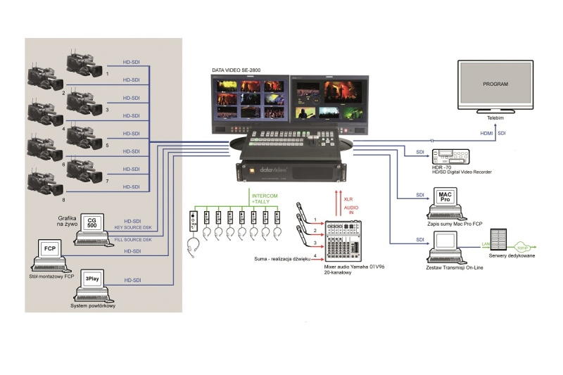 Stanowisko Systemu Realizacji Sygnału na żywo (4:2:2) marki Data-Video HS3200(12) i HS1200(6) dla18 torów wizyjnych do realizacji z kamerami systemowymi XDCAM-HD PXW 500 z poziomami kamer MCU, interkomami TS-100z tally